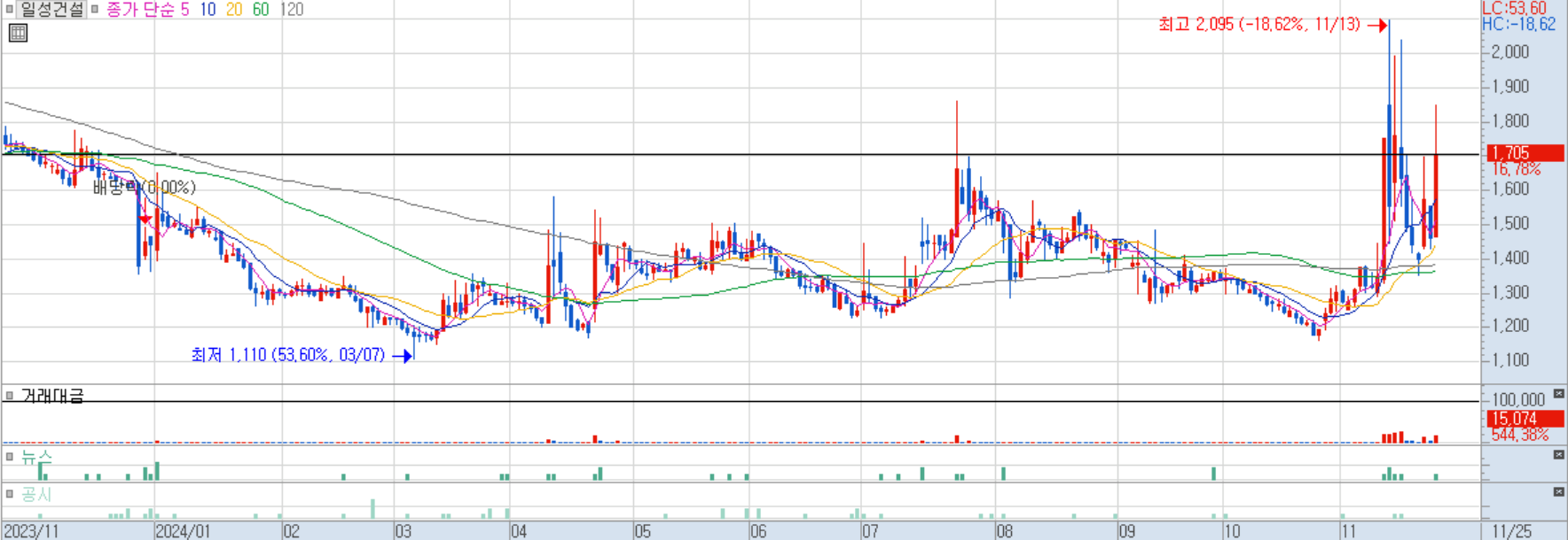2024/11/25 남양주진접2 A-1BL 아파트 건설공사 5공구 낙찰 소식에 급등