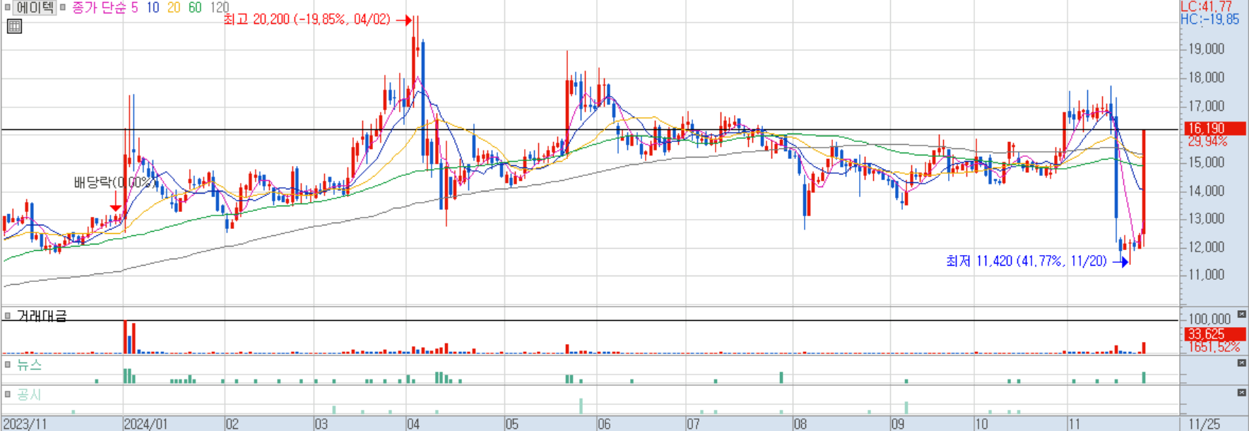 2024/11/25 이재명 더불어민주당 대표, 위증교사혐의 1심 무죄 선고 소식에 정치/인맥(이재명) 관련주로 부각되며 급등