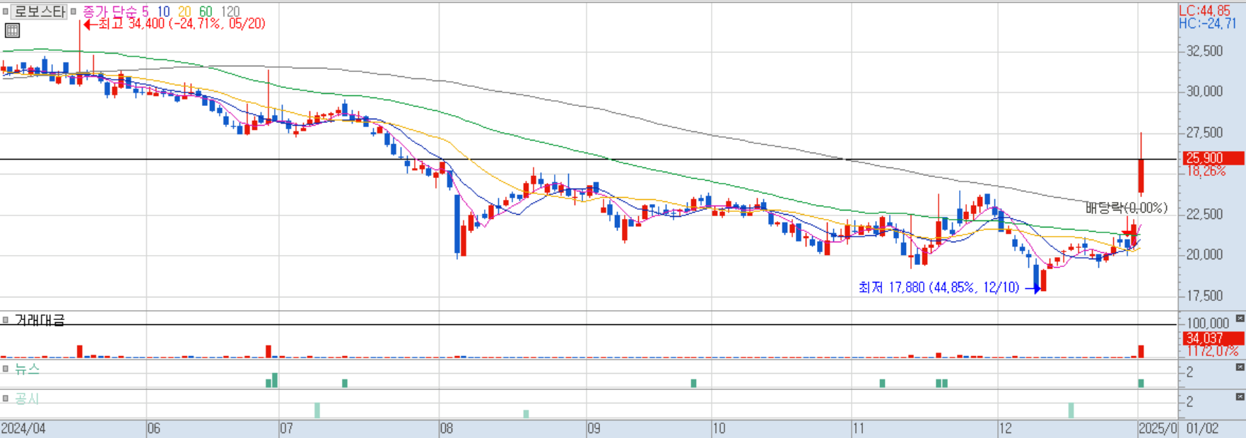 2025/01/02 로봇(산업용/협동로봇 등) 및 방위산업/전쟁 및 테러 테마 상승 속 급등