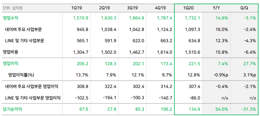 - 비즈니스플랫폼 매출 확대, 네이버페이 거래액 증가, 웹툰의 글로벌 성장 지속에 따라 YoY 14.6% 증가
