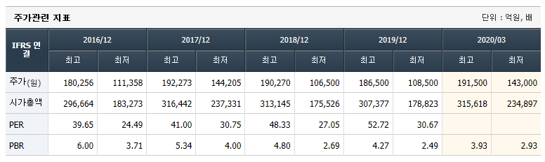 다음 주가관련 지표를 보면 2016년 최고 주가는 18만원이었습니다.