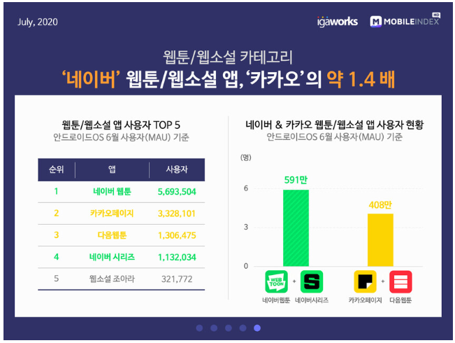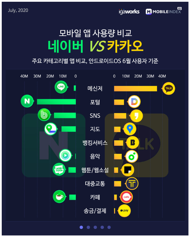 웹툰은 네이버, 대중교통은 카카오 택시, 카페는 네이버, 결제시스템은 카카오페이가 앞서고 있습니다.