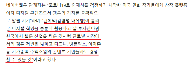 또 팬데믹이 불러 일으킨 디지털 혁명을 충분히 활용하고 잘 투자하면 글로벌 시장에서의 웹툰을 키우고 넓혀 디즈니, 넷플릭스 등 세계적인 기업들과도 경쟁할 수 있을 것이라고 했습니다.