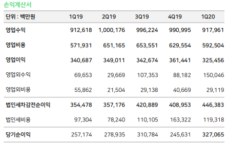 2020년 3월 전년동기 대비 연결기준 매출액은 14.6% 증가, 영업이익은 7.4% 증가, 당기순이익은 42.5% 증가.