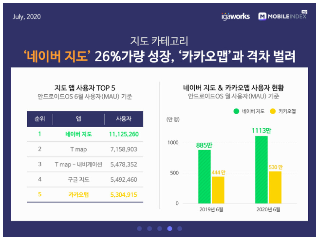 SNS는 네이버 밴드가 앞서며 지도 또한 네이버가 앞서고 있습니다.