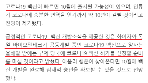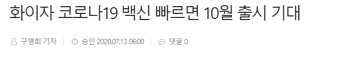 화이자가 코로나 백신이 빠르면 올해 10월 출시도 가능할 것이라고 밝혔습니다.