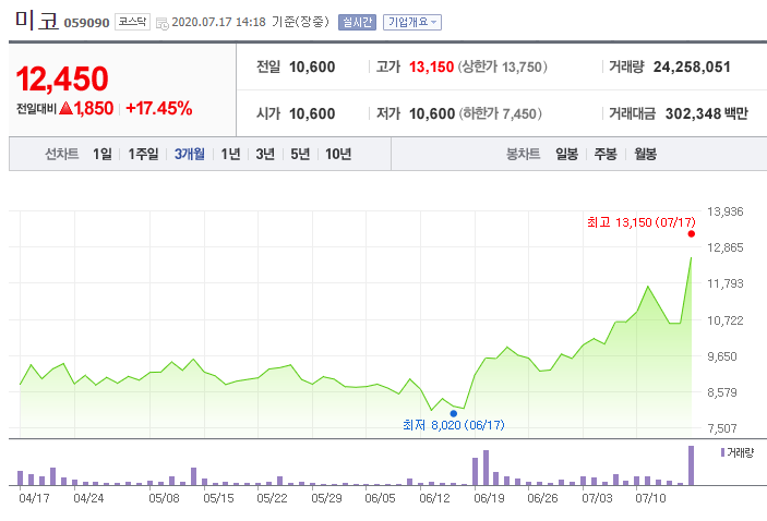 미코가 수소차 관련주로 움직이면서 주가가 최대 24%까지 상승했습니다.