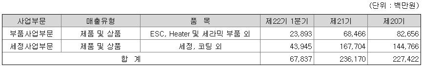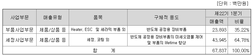 동사는 종속회사 8개사를 포함하여 주요 사업으로 반도체 및 LCD 장비를 구성하는 부품을 제작하는 부품사업부문과 반도체 및 LCD 장비를 구성하는 부품의 세정과 코팅을 영위하는 세정사업부문이 있음.