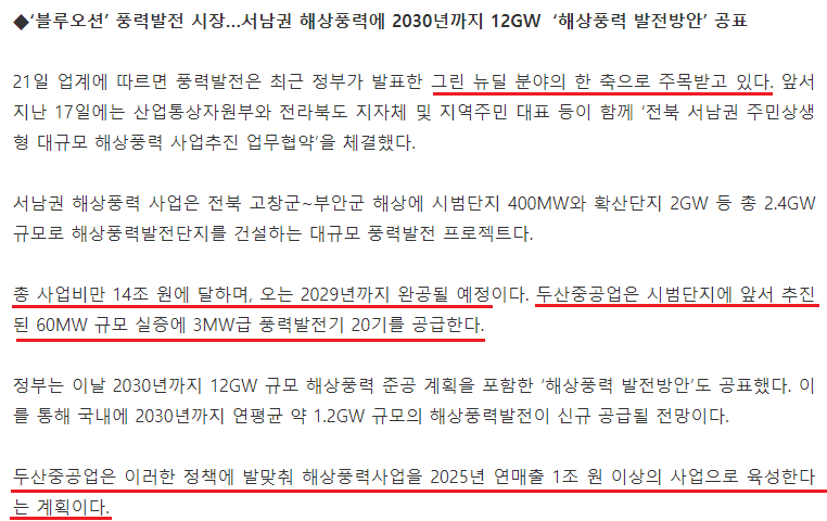 두산중공업이 2029년까지 총 사업비 14조원을 들여 서남권 해상풍력 사업을 계획하여 2.4GW규모로 해상풍력발전단지를 건설하는 프로젝트를 진행한다고 합니다.