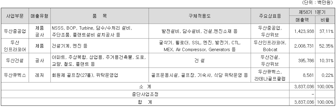 2001년 두산중공업주식회사로 상호 변경. 발전설비 및 담수설비, 주단조품, 건설(두산중공업), 건설중장비 및 엔진(두산인프라코어), 토목과 건축공사(두산건설) 등의 사업을 영위 중입니다.