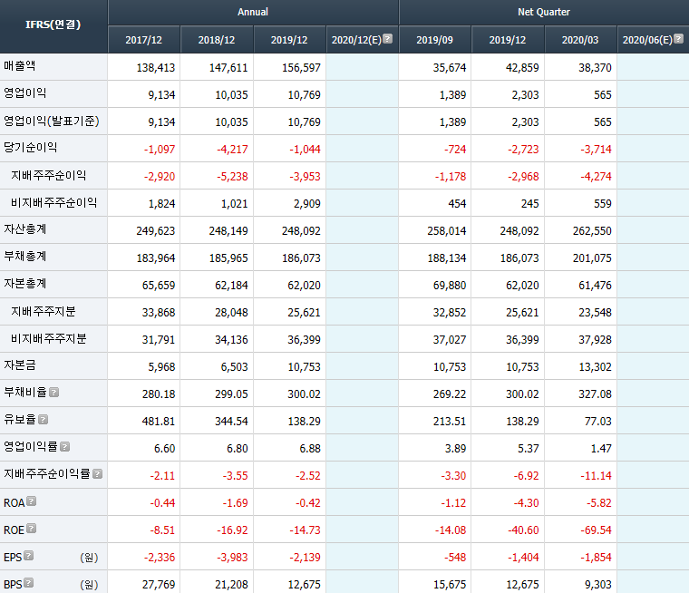 2020년 3월 전년동기 대비 연결기준 매출액은 0.2% 증가, 영업이익은 82.5% 감소, 당기순손실은 1011.7% 증가했습니다.