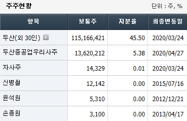 두산(외 30인)이 두산중공업 주식의 45.5% 지분을 차지하고 있습니다.