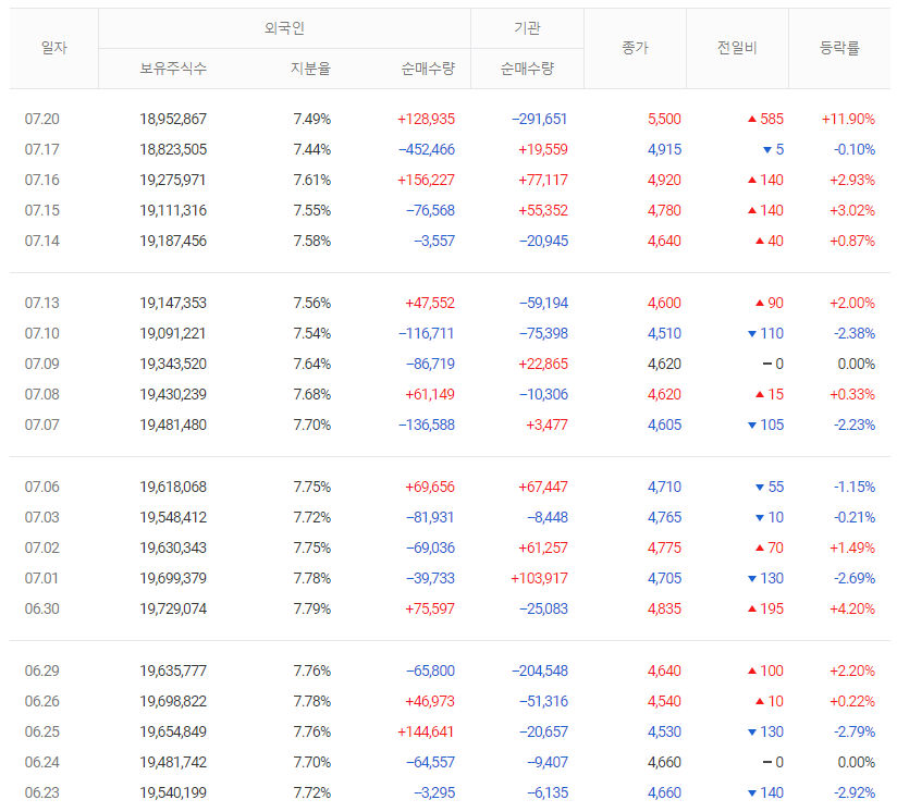 그리고 올해 2020년 1분기에는 최고 6,220원을 기록했으며, 현재 7월 상한가를 기록하며 7,150원을 기록했습니다.