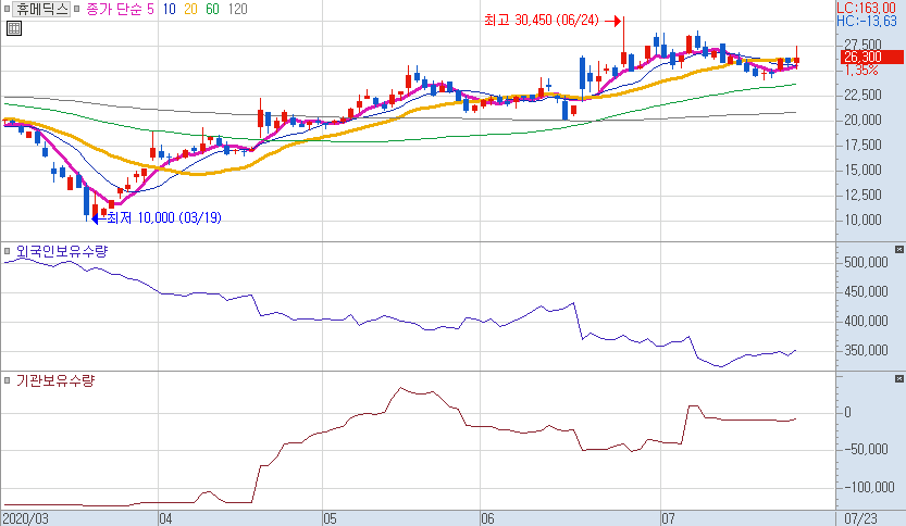 휴메딕스의 주가가 조금씩 상승을 하면서 기관보유량을 늘고, 외국인 보유량은 줄어들고 있습니다.
