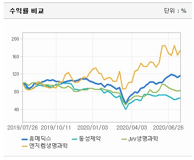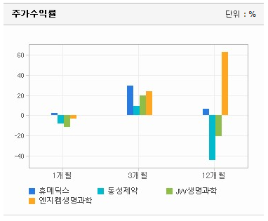 휴메딕스와 경쟁사들의 수익률을 비교해보면 휴메딕스가 4개의 기업 중 2위를 기록하고 있습니다.