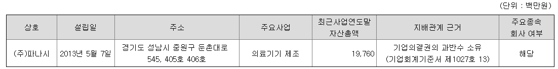 | 2016년 09월 | 파나시 지분 및 경영권 취득 |