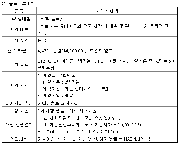 - HABIN사는 휴미아주의 중국 시장 내 개발 및 판매에 대한 독점적 권리 획득