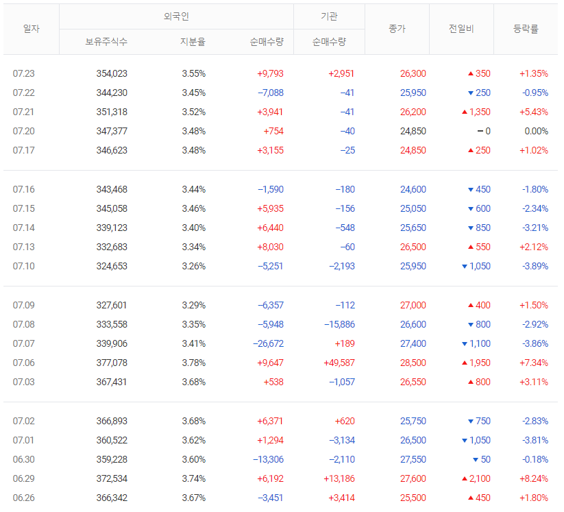 그리고 올해 2020년 1분기에는 22,750원을 기록했고, 현재 7월 26,300원으로 마무리 후 시간외 28,900원을 기록했습니다.